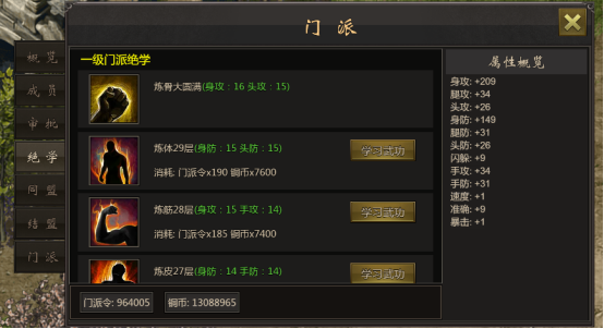 玩家加入门派后不仅可以学习到高深莫测的门派技能,还可通过每日任务获得门派令和门派贡献,消耗相应的门派令和铜币可以学习门派绝学,随着门派等级越高,开放更高阶的绝学可供学习。
