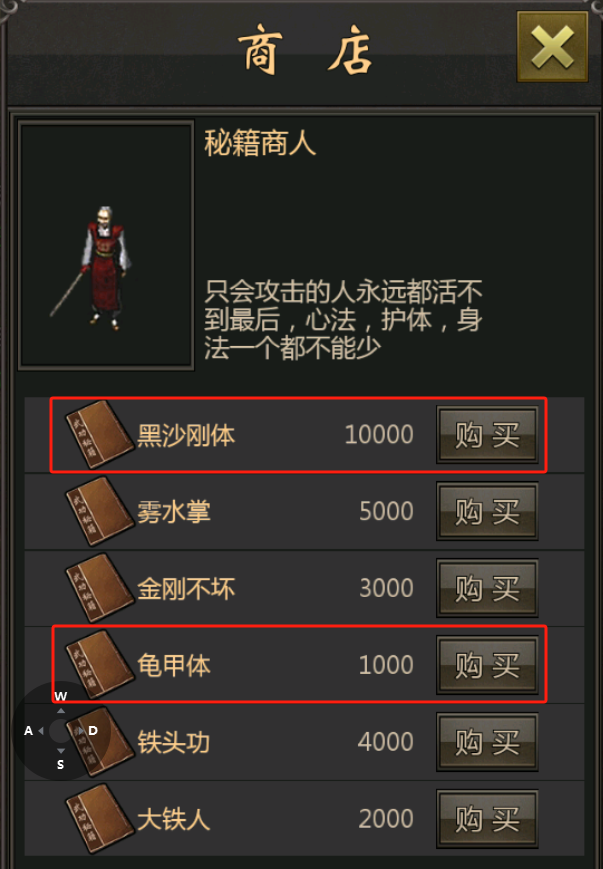 完成任务后我们会回到熟人「老侠客」这,通过指引完成购买护体。一般情况下,此时我们的铜币已经所剩无几了,因此购买一本龟甲体就可以了。